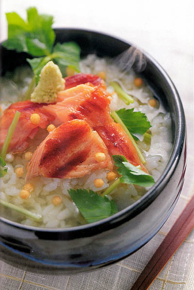 Of course, the flavor of the dish will improve if you are particular about the rice, the type of tea, and the topping. Favorite Japanese toppings are pickled plums (umeboshi), dried sea laver (nori), grilled salmon, soy-simmered fish and seaweed, tempura, broiled eel, and so on. Alternatives from Western cuisine are grilled chicken, grilled salmon, pickled cucumber, smoked salmon, and oysters marinated in oil.