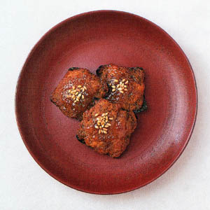 4. Arrange on a serving plate, drizzled with the mirin-and-soy-sauce mixture, and garnished with sesame and shichimi.