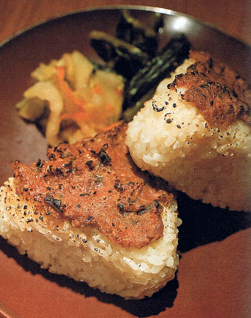 Grill the rice balls over a medium flame until golden brown, then turn over. Spread the vegetable miso (see below) on the browned surface. When the other side is well grilled, remove from the flame and lightly scorch the miso with a kitchen torch.