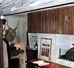 The two tiny dining rooms are rustic and cave-like, the stucco walls decorated with animal pelts and a boar's head. The name means "the hunt", and the specialty is seasonal game (pheasant, boar,...
