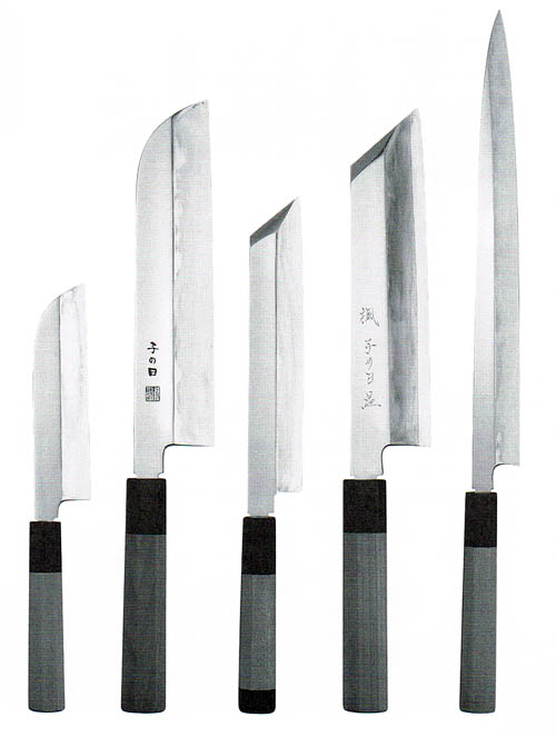 The first two work especially well for carving garnishes, the next two for katsura-muki daikon sheets, and the last for sashimi. Listed by name from left to right, they are kurimuki-bocho ("chestnut-peeling" knife), usuba-bocho (thin-blade knife), mukimono-bocho (garnish knife, small and large), and yanagiba-bocho ("willow-leaf-shaped" knife).