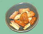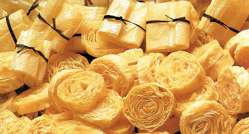 Yuba is perhaps the quintessential Kyoto ingredient. Skimmed from open vats of steaming soy milk, yuba is served fresh with a light sauce, or dried in strips or rolls to be used later in soups and a variety of inventive ways. Almost pure protein, yuba is an important ingredient in Zen vegetarian cooking (as is fu, its glutinous wheat counterpart). The flavor is subtle, and indescribable; the texture, delicate. Yuba is a backdrop against which other ingredients play - the blank space that defines the culinary lines, a master's touch to a cuisine that is truly an art.