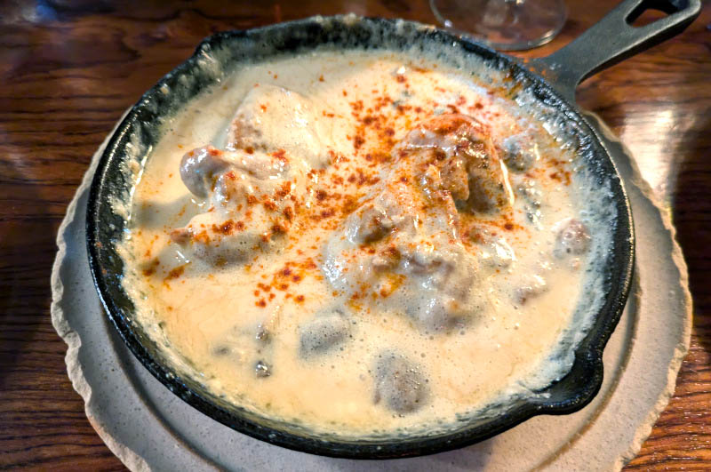 One standout, though it's not especially smoky, is the Shkmeruli - a fantastic Georgian stewed chicken in garlic cream sauce. Fried oysters are livened up by an excellent homemade tartar sauce, and the delightfully fatty bacon is an essential order. A plate of "mixed greens" turns out to be big enough for a group, and provides a nice contrast to all the meat and seafood dishes.