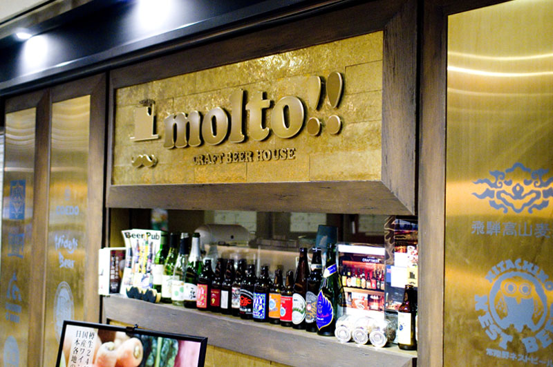 Craft Beer House Molto is definitely the highest craft-beer bar in Osaka, offering a fine view of the city from its 31st-floor location. There's a full menu of Italian food (budget around Y4,000 at dinnertime), or you can just stop by for a beer, either at the 20-seat bar or in the standing (viewless) area up front.