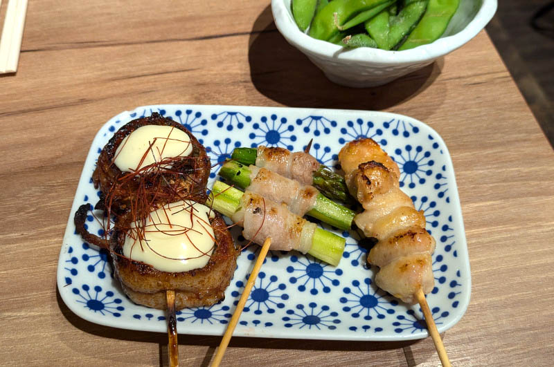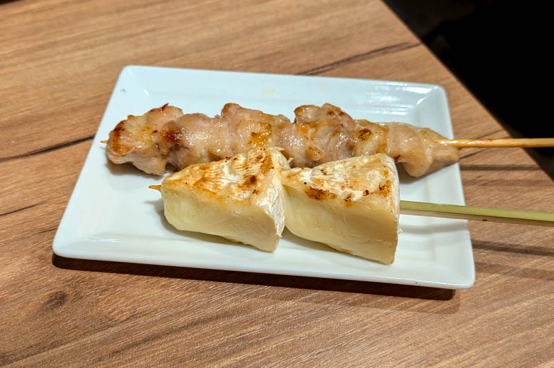 Tempting skewers of grilled meats and vegetables - often smothered in cheese or paired with bacon - are the draw at this very casual yakitori shop. Popular favorites include grilled camembert cheese wedges, shiitake mushrooms with butter-soy sauce, "kujo negi" Kyoto green onions with cheese, and bacon-wrapped asparagus spears. They also do a good job with more standard skewers like chicken thigh meat, tender beef skirt steak and fatty chicken tail.