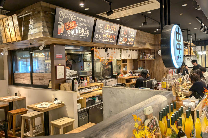 Budget-friendly wines, fruit-based liqueurs and beer are among the drink options. There's a small table charge, which gets you a paper bag filled with edamame. The shop is located in the basement of Osaka Station's Lucua mall, convenient for grabbing a beer and a few skewers before catching a train.