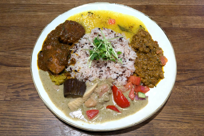 At lunchtime you can order a plate with one, two or three different curries, which come with rice and a small helping of dal for contrast. The three-part combo plate includes a meaty chicken curry packing quite a bit of heat, a dry-style pork keema curry and a Thai green curry with tender bamboo shoots and fresh vegetables.