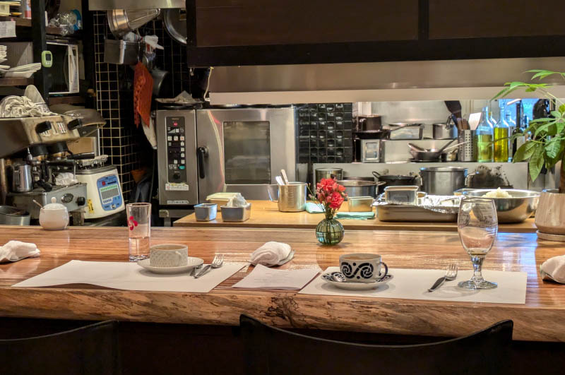 The dining room is casually elegant, with ample counter space for solo diners and walk-ins. The open kitchen makes the most use of the space, and gives a light, airy feel to the dining room. Service is cordial and professional.