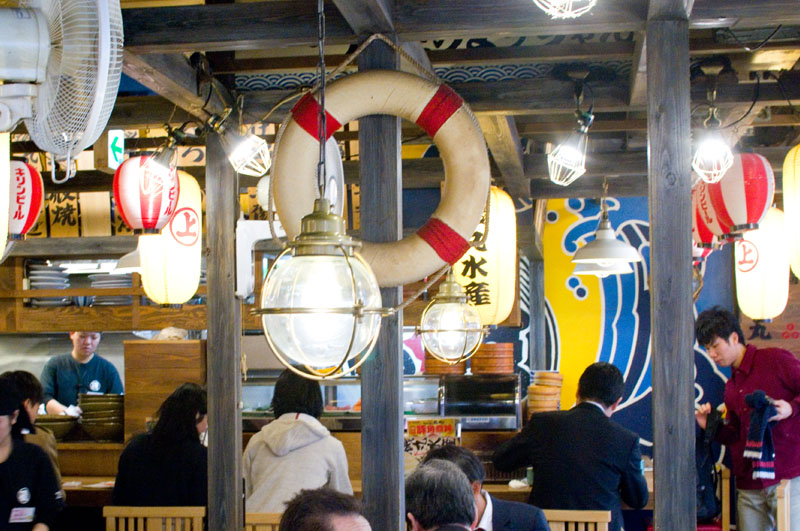 The lunchtime menu (served 11am-5pm) offers particularly good value for money, with nineteen very attractive seafood donburi options. If you're extra hungry you can add on side dishes like negitoro and potato salad. Prices are only a bit higher in the evening, but the menu expands quite a bit. Specialties of the house include clams, scallops and other shellfish grilled in their shells, plus a large selection of sashimi platters.