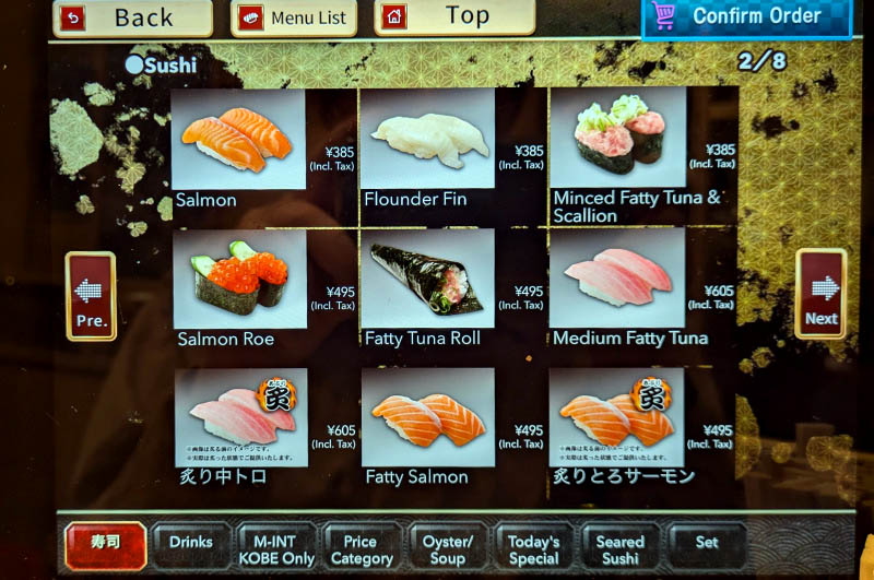 Most sushi is ordered by the pair, but they also put together three-piece "sets" showcasing for example three varieties of tuna or three kinds of seared fish, and these are worth checking out. Drinks include several wines by the glass as well as beer and sake.