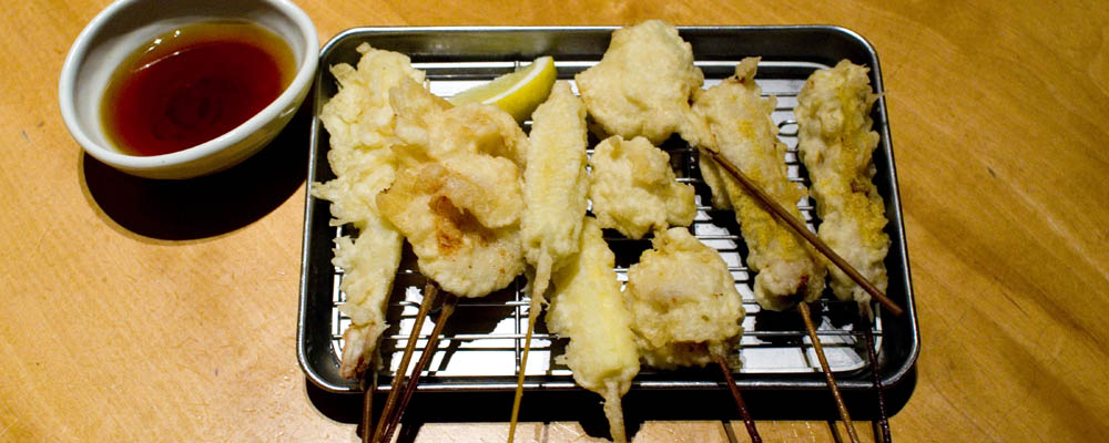 Top-quality seafood, meats and vegetables go into the kushiage here, and while the average dinnertime budget is around Y6000, lunch is a real bargain at just Y1000. The set lunch features eight assorted deep-fried skewers, and since it's the only thing on the menu you can just take a seat at the counter and wait for your freshly prepared skewers to arrive, one by one, on your plate. ....