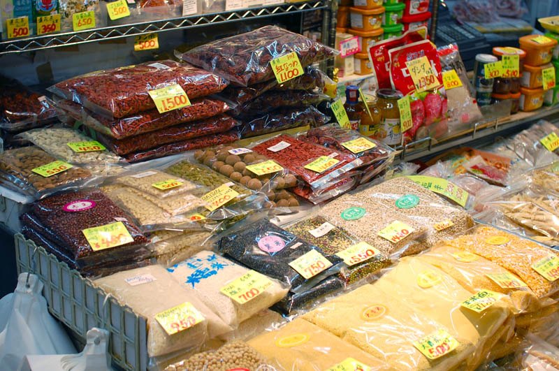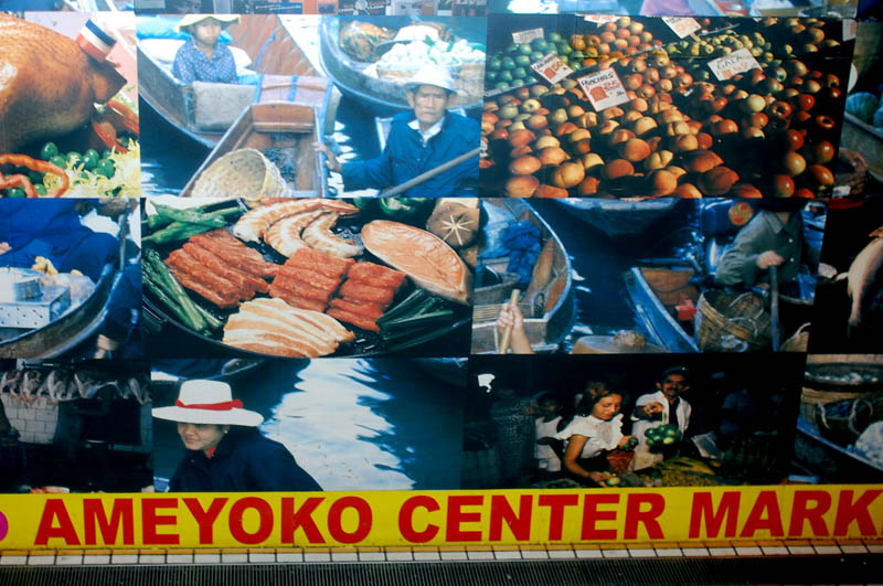 The market building is located at the entrance to the very lively Ameyokocho shopping street, which is lined with shops selling discount clothing and other goods.
