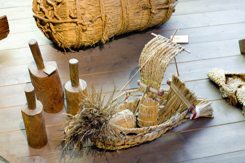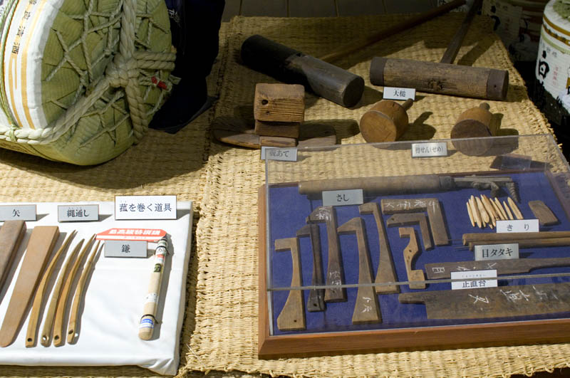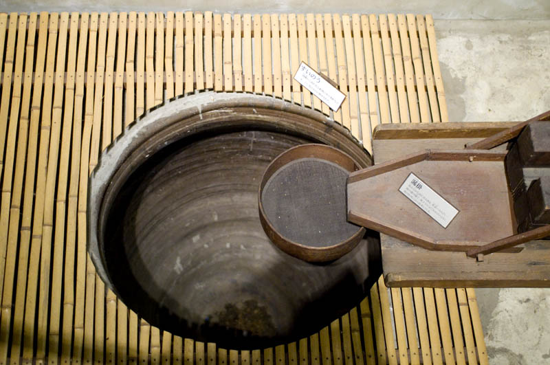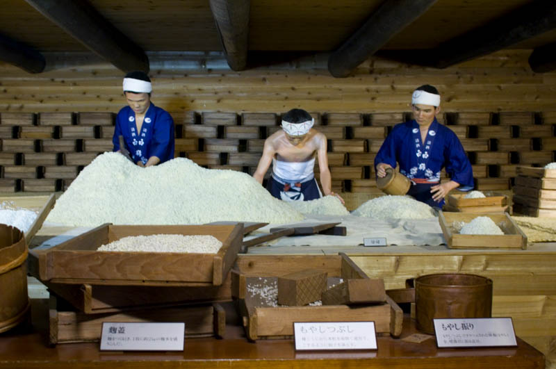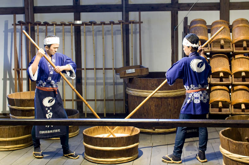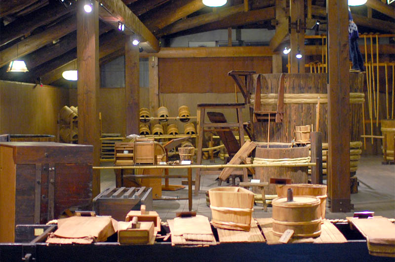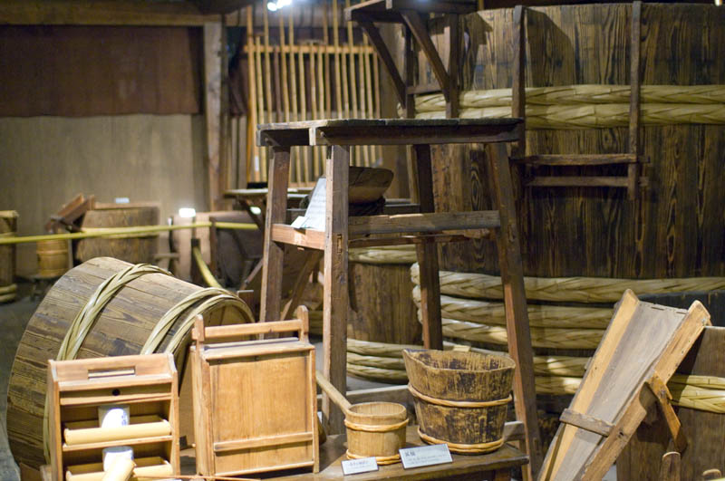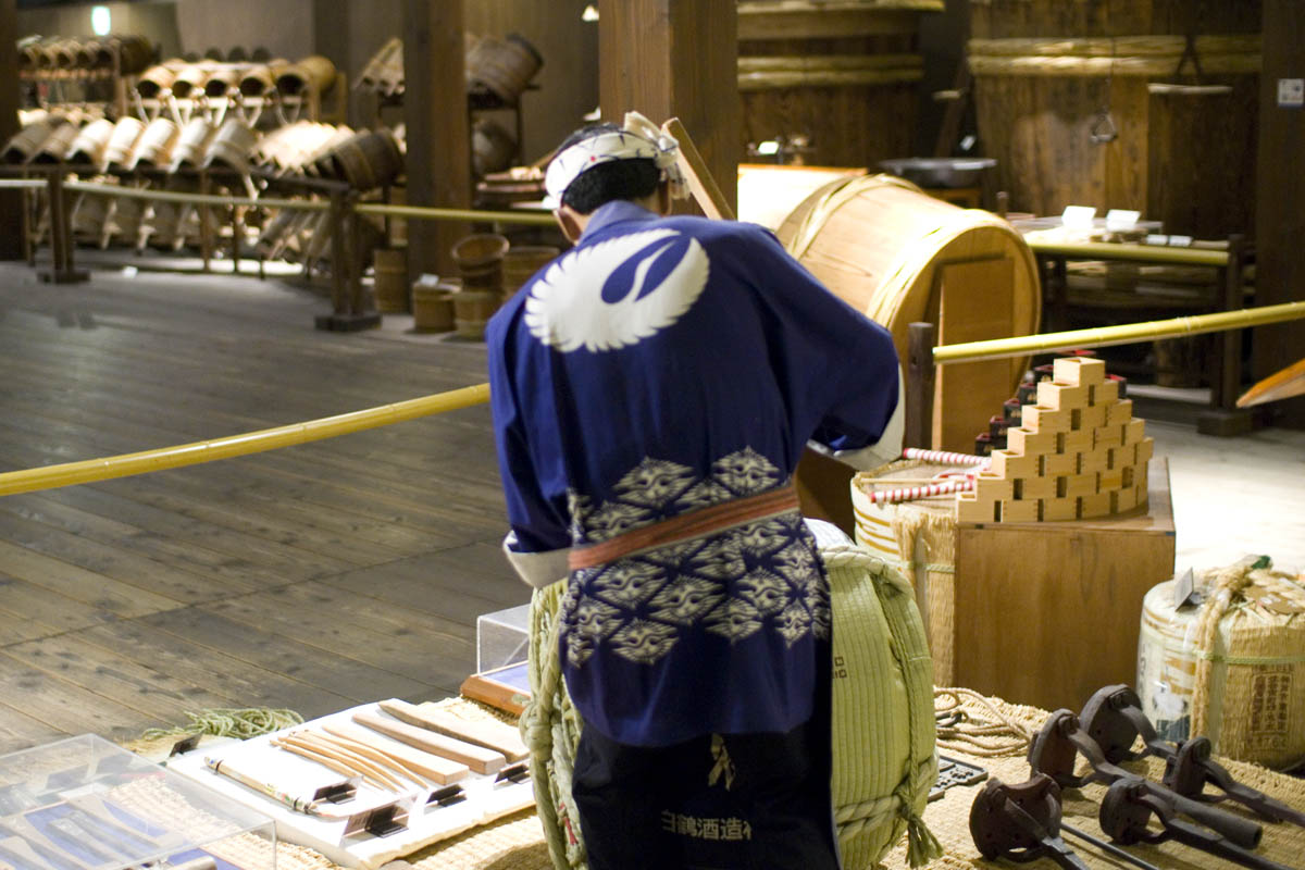 This brewery museum is one of the most interesting of the many sake attractions in Kobe's compact brewery district. It's actually been put together inside an old sake kura, so unlike a modern museum it really smells like old wood and straw. There are life-size mannequins throughout the big two-story structure, caught in the act of inspecting the mash or stirring the yeast or performing any of the other many sake-making steps that are explained in great detail.