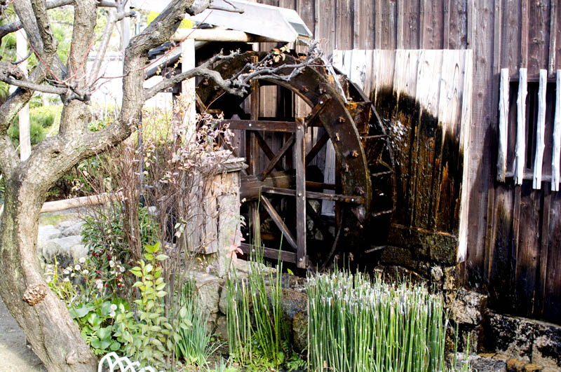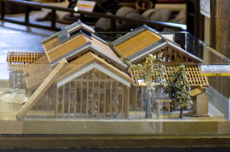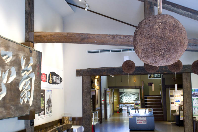 Out in the front yard there's a small traditional rice-polishing mill, powered by a working waterwheel. Once you're inside the museum, the entrance hall displays scale models of tradtional brewery buildings as well as old sake advertising posters.