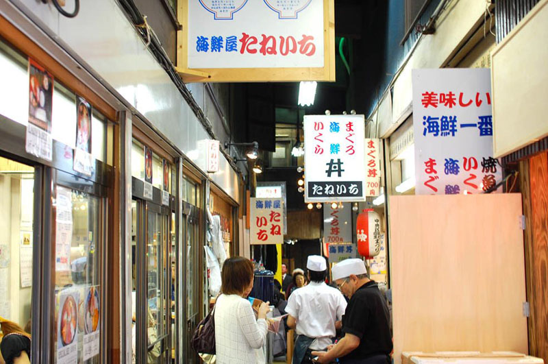 Originally set up to serve restaurants, the Outer Market is now also open to the general public. Here hundreds of crowded stalls sell fresh seafood, vegetables, tea, dried seaweed products, professional kitchen knives and servingware. There are also numerous sushi and other restaurants scattered through the district, where you can enjoy very fresh fish without waiting on a long line.