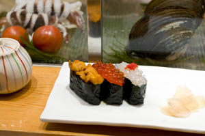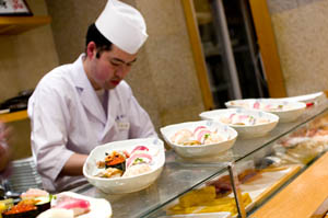 This is the small, main branch of a famous sushi-shop chain, located inside the former market and boasting the freshest fish selection. Their very nice standard sushi assortment is around Y3,900.