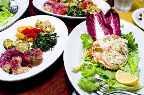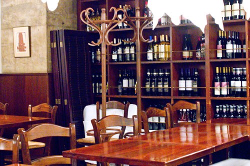 The stand-up bar at the front of Il Bacaro has a nice casual feel to it. You can drop in for a few minutes, have a quick glass of wine and a tiny snack, and be on your way. Or you can claim a seat at one of the three small tables and linger awhile, directing your attention to some of the dozen or so wines served by the glass. Cold appetizer trays line the counter, an espresso machine grinds away in the background, and dancehall reggae or pop music plays on the stereo. Waiters from the main dining room come and go with drink orders, and customers drift in and out. Snatches of Italian can be heard from time to time.