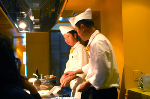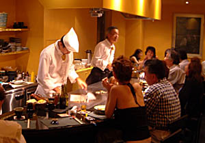 At first glance it seems more like a bar than a restaurant here (and in fact there's a late-night bar upstairs in the same building, under the same management). There's a nice low-key atmosphere and a crowd of neighborhood regulars. Most of the seating is at a big counter that wraps around the grill area, where the chefs are hard at work chopping and sauteeing. (There are a few tables that may work better for groups, but most customers prefer the entertainment and interaction at the counter.)