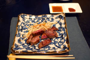 The menu is large but not very complicated - sauteed seasonal vegetables, sauteed seasonal fish and shellfish, steaks and okonomiyaki - almost everything straight off the grill. The focus is more on good-quality ingredients rather than dazzling recipes, so the excellent grilled salmon for example is served with just a bit of lemon, a sprig of dill and a dollop of tartar sauce. Japanese beef steaks come with toasted garlic chips, some bean sprouts and a Japanese-style ponzu dipping sauce. Eringi mushrooms come with a perfunctory dab of mustard.