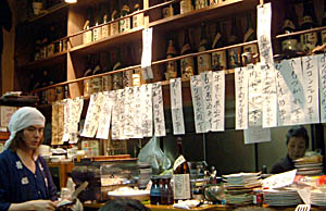 An astonishing selection of sake, with a full menu page of new, limited-edition arrivals every week. The food tends towards simple, country-style fare, and the atmosphere is very down-home - it's a mother-and-son operation, with mom in the kitchen and her son (the "ko" in Tsukushi-no-ko) out on the floor pouring sake and making recommendations.