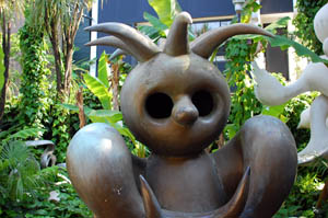 A relaxing, quiet space inside a museum devoted to the whimsical works of sculptor Taro Okamoto.