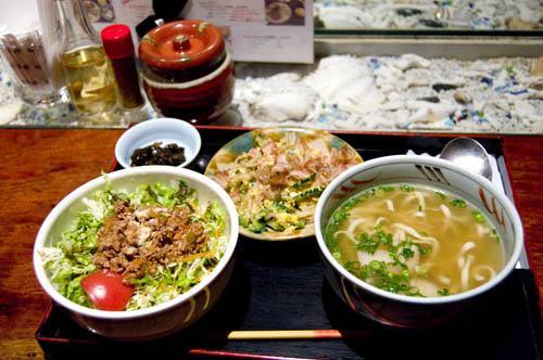 The "black rabbit" is a lively after-work pub serving tasty Okinawan food and drink (especially their stir-fry dishes). Prices run around Y500-700 for small dishes. Lunch ranges from Y680-Y1100 and includes unusual dishes like goya-champuru curry.