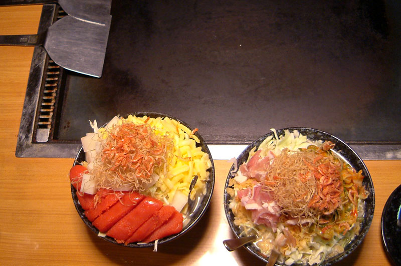 Located in the middle of Tsukushima's bustling monjayaki district, Oshio is a comfortable place to try out this local Tokyo version of okonomiyaki. The large menu includes dozens of variations such as spinach-tomato, spicy Chinese tofu, and mentaiko (cod roe) with cheese, as well as teppanyaki-grilled salmon and scallops. Monjayaki is Y1000-1300.