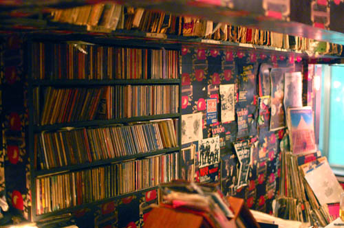 This tiny, ramshackle hole-in-the-wall is a late-night Shimo-Kitazawa legend, going strong since 1974. The space behind the bar is filled with mountains of CDs and shelves of vinyl (many of them 70s UK glam rock and local Japanese bands), and the seating area is so small that you have to step outside to let other customers in and out. When you order a drink the bartender telephones the similarly dilapidated sister bar just upstairs (Trouble Peach) and they deliver. (Y400 cover charge.)