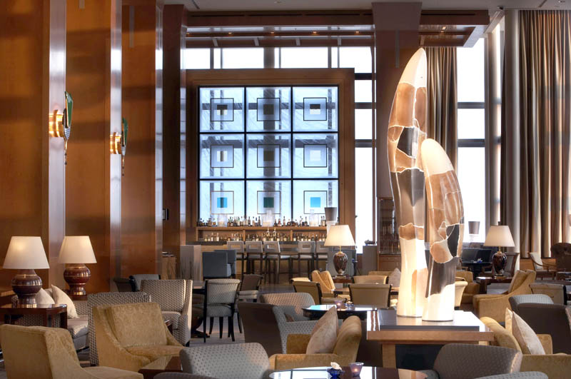 Perched high above the city on the 45th floor of Tokyo Midtown's Ritz Carlton Hotel, the Lobby Bar overlooks Tokyo Tower and the surrounding area. Nestled in overstuffed chairs with pillows covered in candy-colored pastel silk, visitors can enjoy spectacular views while listening to live Bossa Nova from 2:30-midnight. The interior, designed by Frank Nicholson, is modern but traditional, with impressively high ceilings and amber wood walls illuminated by giant inverted-gumdrop lamps.