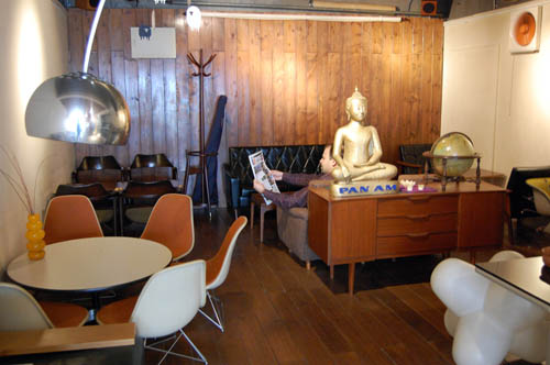 Mugs Cafe is the joint venture of three young designers, and the decor is a fusion of fifties cool and Asian lounge. Sheep dangle from a mobile over Eames-style fiberglass chairs and black leather couches. On the walls hang paintings and photos by local artists.