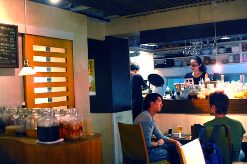 An extensive vinegar menu is one of Marusan's quirky features: they list several pages of oddly compelling vinegar-based cocktails and soft drinks, and even the food menu has a vinegar soup section (punnily listed as "su-pu"). The atmosphere is laid back, with comfortable sofas and jazz on the stereo. All the food we tried was top-notch; our champuru stir-fry filled with lots of fresh vegetables and our tender grilled chicken set off by an excellent spinach sauce.