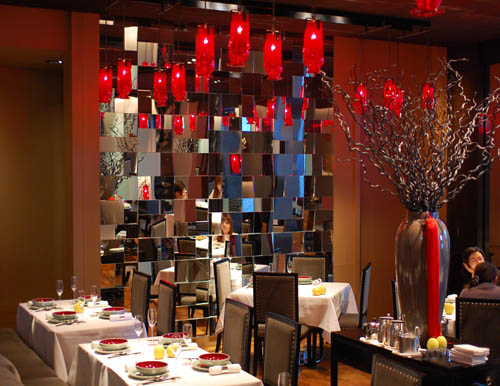 The stylish main dining area, decorated with mirrored glass surfaces and illuminated leaf-patterned panels, seats around fifty and features three intimate booth tables. Private rooms are also available. Prices are subject to a 10% service charge.