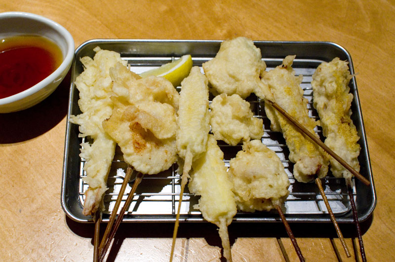 The kushiage is rustic in style, with a thick, rough layer of batter that's fried to a satisfyingly crunchy consistency. Some recommendations include skewers of curry-flavored pork belly (buta bara), deep-fried cheese, chicken breast with ume (plum), shrimp and scallops. The latter two are Y250 per skewer, the most expensive items on the menu.