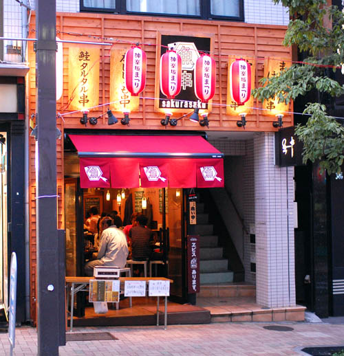 The specialties here are charcoal-grilled fish and seafood on skewers, plus deep-fried fish and vegetables on skewers. There's a big open kitchen and counter area, plus high tables with stools. Budget around Y2800 for food and some drinks.