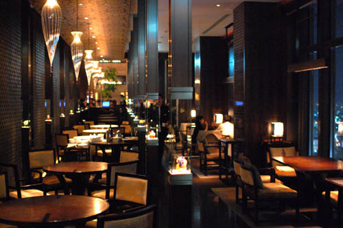 The sleek Nouvelle-Chinoiserie interior takes advantage of the view and is smartly appointed in dark wood and richly textured fabrics, with jewel-toned glass bottles cleverly encased in slender pillars. Toward the back of the restaurant, rows of black tassels dangle from the ceiling and elegant Chinese vases line the shelves.