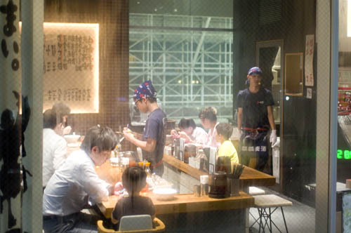 A branch of the famous Hakata ramen chain, featuring thin, slightly chewy noodles in a pork-based broth ("red" or "white"), with or without extra chashu. You can add your own freshly grated garlic.