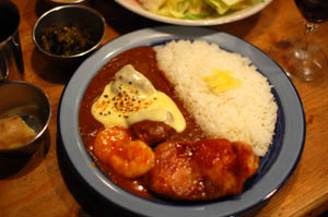With its exotic-ethnic decor and Hawaiian background music, the atmosphere here is closer to a Bohemian cafe than a curry shop. The curry menu itself is rather exotic too - variations include ratatouille, avocado, pig's foot, and leek curries. The "Zenbu" (everything) curry (Y1550) is a good introduction - it contains beef, pork, chicken, shrimp and cheese in a sweetish roux, and it's quite filling.