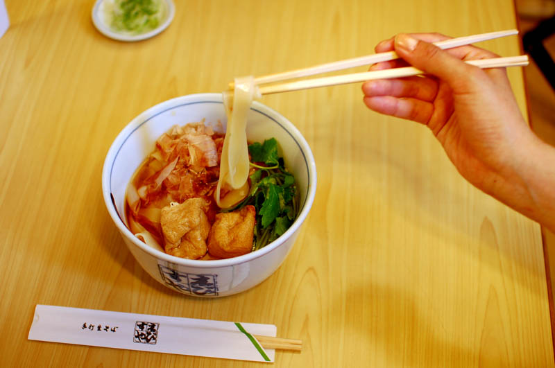 Thin, flat kishimen noodles are a featured dish here, served in a hot fish-based broth with fish cakes, fried tofu, boiled spinach and other ingredients. Another popular dish is their rather novel curry-cheese udon noodles.