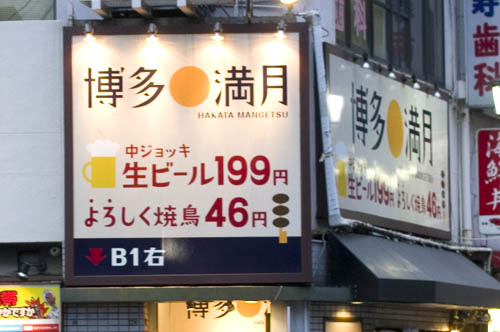 A lively basement izakaya, Hakata Mangetsu has a charming style all its own: mismatched sofas and chairs that look like they've put in years of service; an infectiously bouncy eighties-pop soundtrack; and laid-back but friendly service. Plus prices that are hard to believe in such a prime location - yakitori from Y46 per skewer, Suntory Malt's beer at Y208 a glass, and two-hour open-bar plans for just Y780 between midnight and 5am.