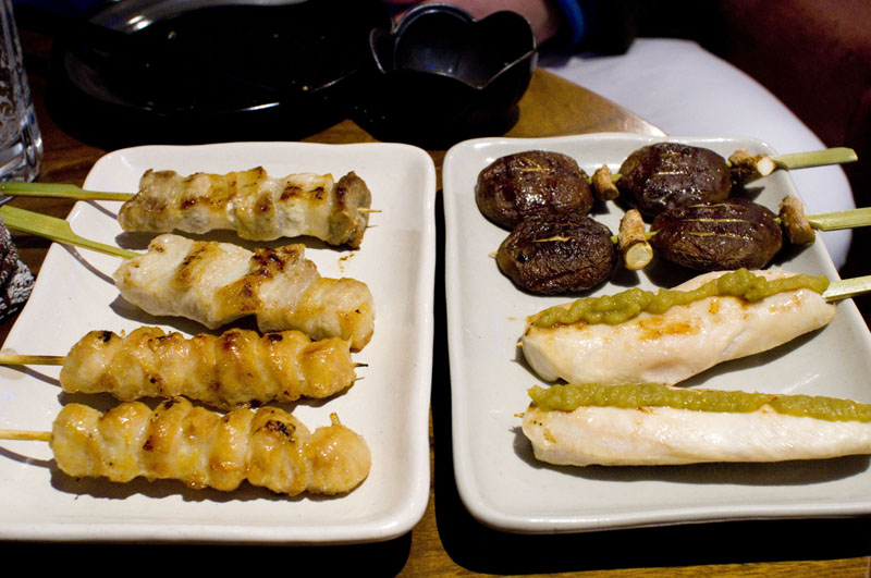 The food is fairly decent and good value for money, with some nice bargain surprises like the very good cabbage with spicy miso dip (Y280). In addition to yakitori there's a selection of filling nabe stews, starting at Y924 per person, sashimi, and other izakaya standards. The grilled pork is one of our favorites here, and the chicken breast with wasabi is consistently good.