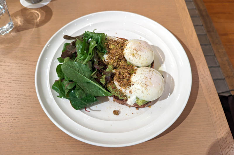 Among the numerous egg-based offerings are a hearty Farmer's Omelette - stuffed with ham, potatoes and leeks - and a high-protein Spinach and Goat Cheese Omelette made with only egg whites. The "Half and Half Eggs Benedict" comes with dual toppings of ham and smoked salmon (the latter of which is also called Eggs Royale). Rocket and other accompanying greens are nicely seasoned and come in ample portions.