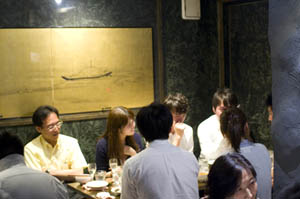 Seating is at small horikotatsu or at the small counter; there's also one window booth, where smoking is allowed. The elevator opens onto Tokyo's tiniest genkan, where you're meant to take off your shoes, so large groups might take awhile to enter and exit. Budget around Y2500-3500 for a few rounds of sake and snacks, more for a full evening.