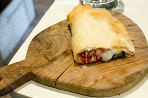 Our lunchtime starter was a simple and wholesome plate of steamed vegetables - cabbage, eggplant, carrot and broccoli - followed at a leisurely pace by three fresh-from-the-oven panzerotti. The pies are reasonably hefty, enveloped in a light, flaky shell. Good-quality olive oil sits on the table alongside rather novel electrically powered salt and pepper grinders equipped with tiny flashlights.
