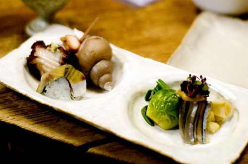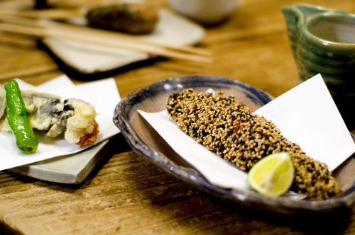 Our shrimp and lotus root hasamiage was fluffy in texture and not the least bit oily, while shishamo, a small fish which is usually served grilled, here was prepared with a crunchy coating of sesame seeds in batter, the sesame providing a nice balance for the fishy flavor.