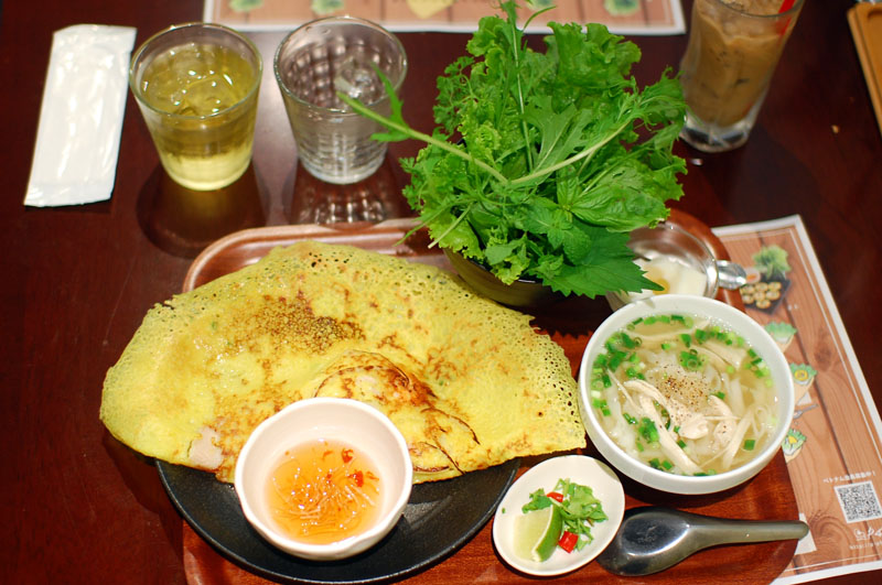 These days you can find pho in many a hip Japanese cafe, but you have to venture further out of your way for good, Saigon-style bahn xeo, those wafer-thin, crepe-like pancakes that are the eponymous specialty here. The banh xeo at Banh Xeo Saigon come in several enticing varieties - shrimp and pork (the standard at most places); mixed seafood; four-mushroom; sakura shrimp; cabbage and pork with mayonnaise; and spicy potato, bacon and cheese. Each order comes with a bowl full of foliage - romaine lettuce, mint leaves, various greens - in which to wrap your crepe.