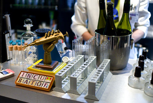 It's like a party in a chemistry lab every night at Science Bar Incubator. Drinks are served in beakers and erlenmeyer flasks, food is heated on wire-mesh stands over alcohol lamps, and customers can change into white lab coats for the duration of their visit. A tasting flight of red wine in a test-tube rack makes a cute photo op, as does the biology-lab microscope that's set up at one end of the bar.