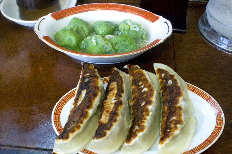 Also worth checking out are the boiled dumplings (suigyoza), filled with an interesting mix of pork and chopped greens and wrapped in a green-colored hand-made casing. Dumpings are served a la carte or as part of a set meal with rice, soup and pickles; budget around Y1000 for a meal.