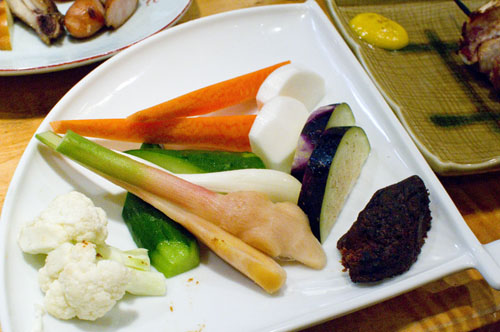 The tsukune (ground pork patties with cartilage) was also good, but probably would have been even better with tare (sauce) rather than just salt. Raw vegetables served with roast miso paste make an excellent side dish, and the picturesque cauliflower, turnips, eggplants and other vegetables are top quality, far better than your typical supermarket produce.