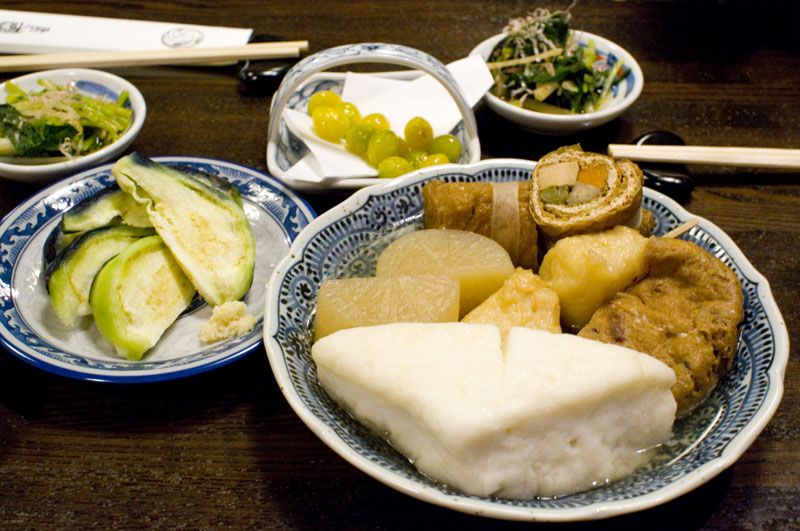 Some highlights include juicy scallops, very airy hanpen, nice plump oysters, and richly flavored Nagoya-style daikon chunks. Assorted sashimi of the day and traditional izakaya-style side dishes are available to supplement your oden if you're hungry. The sake list is quite limited, and there are a few shochu choices. Budget around Y4000 for dinner with drinks.