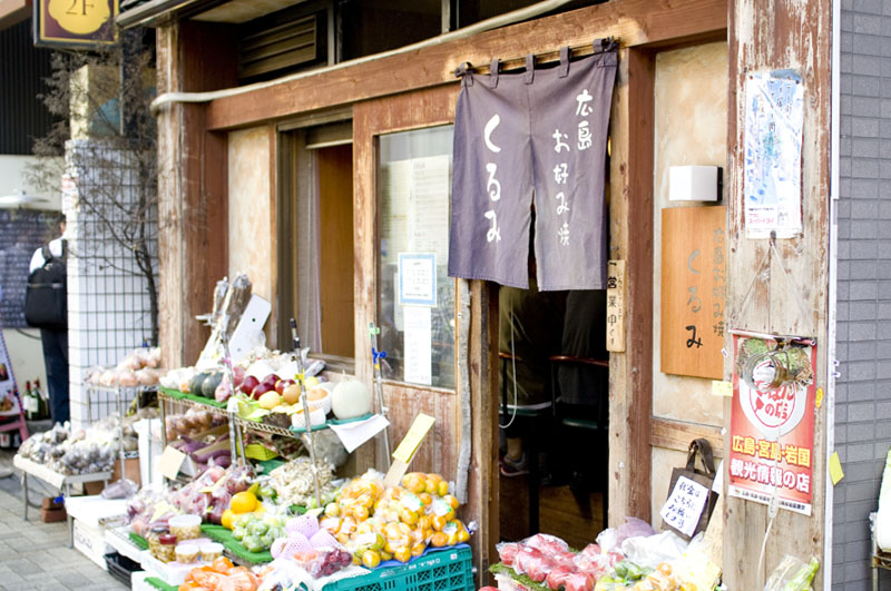 Most seating is at a big counter wrapping around the grill area, so your okonomiyaki can be enjoyed from the hot grill directly in front of you. Adding to the down-home feel, there's usually a fresh vegetable and fruit stand set up in front of the shop. Budget around Y1000 for okonomiyaki, or Y2000-2500 for a bigger dinner with drinks. Note that the lunchtime menu is a bit more limited than at dinnertime, but also a couple hundred yen cheaper.